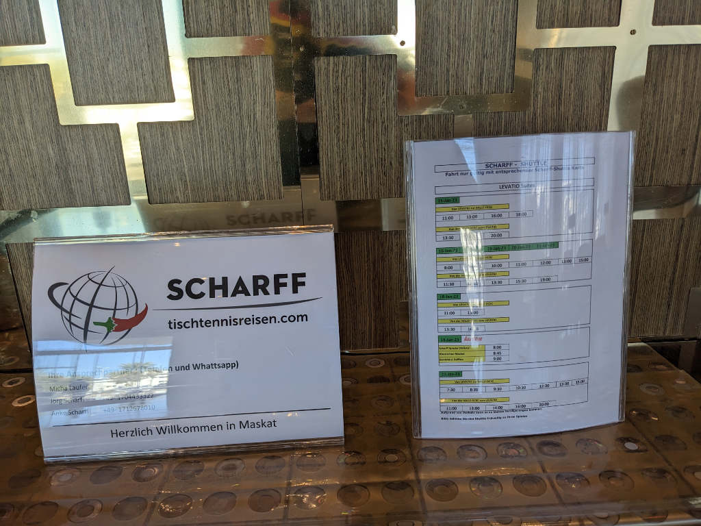 Wir, das Team von Scharff Reisen, sind sehr zufrieden mit der Veranstaltung und unser Kompliment für die gelungene Organisation geht an den Omanischen Tischtennisverband, ein sehr junger Verband mit wenigen Mitgliedern, als Ausrichter des Turniers.